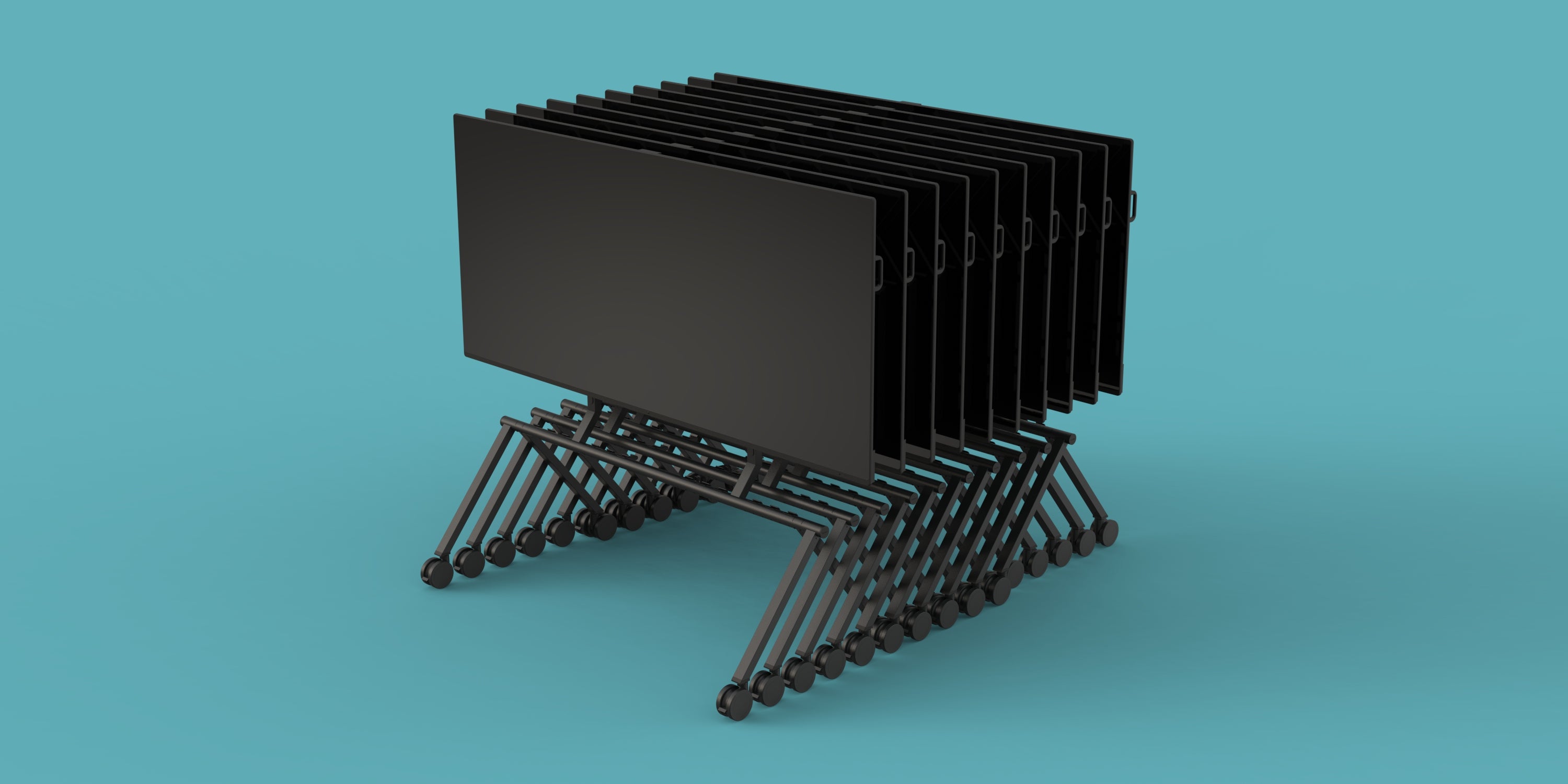 Multiple stands nest together when not in use, freeing floor space. Designed for event venues, all-hands meetings, and organizations that share large displays across the workspace.