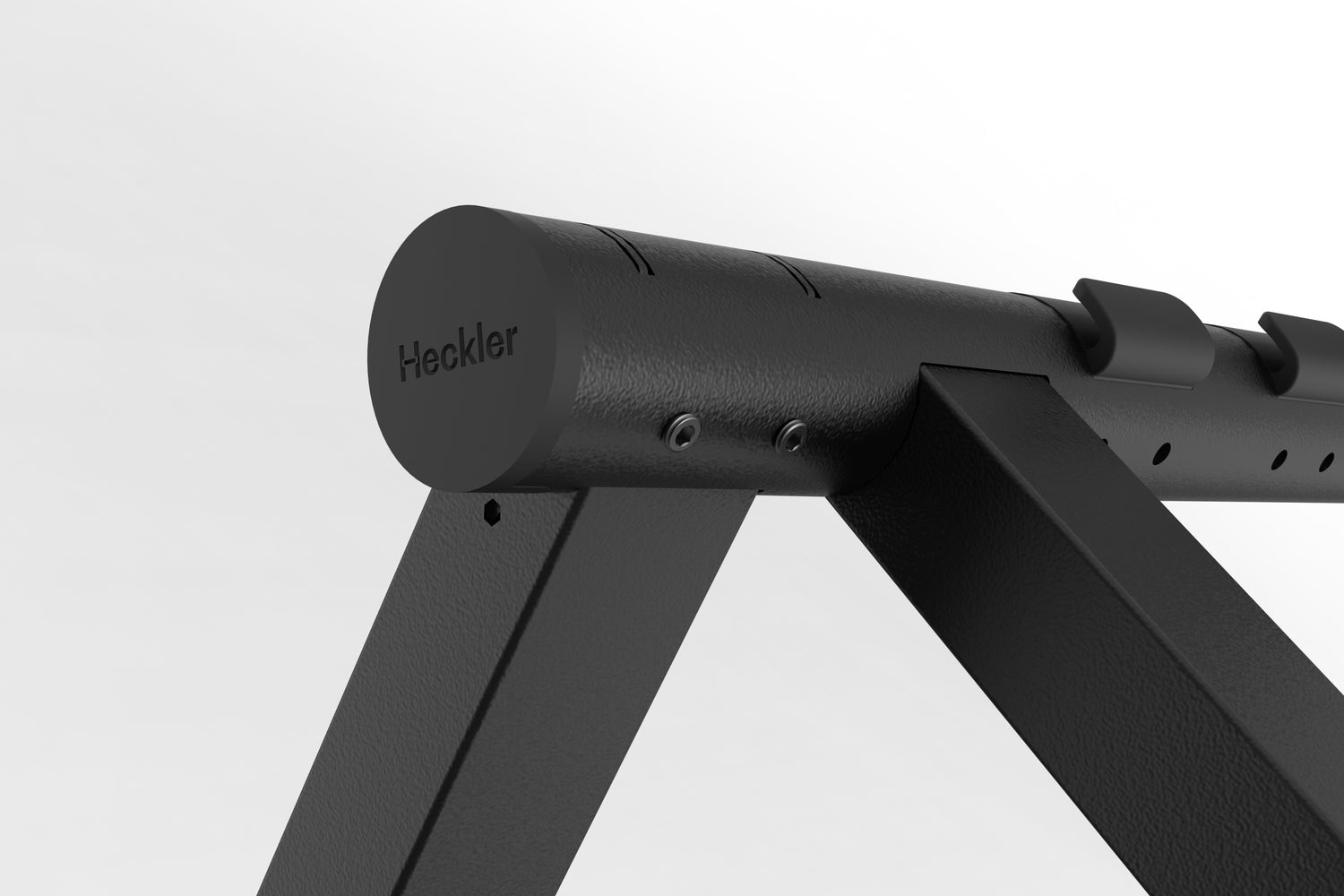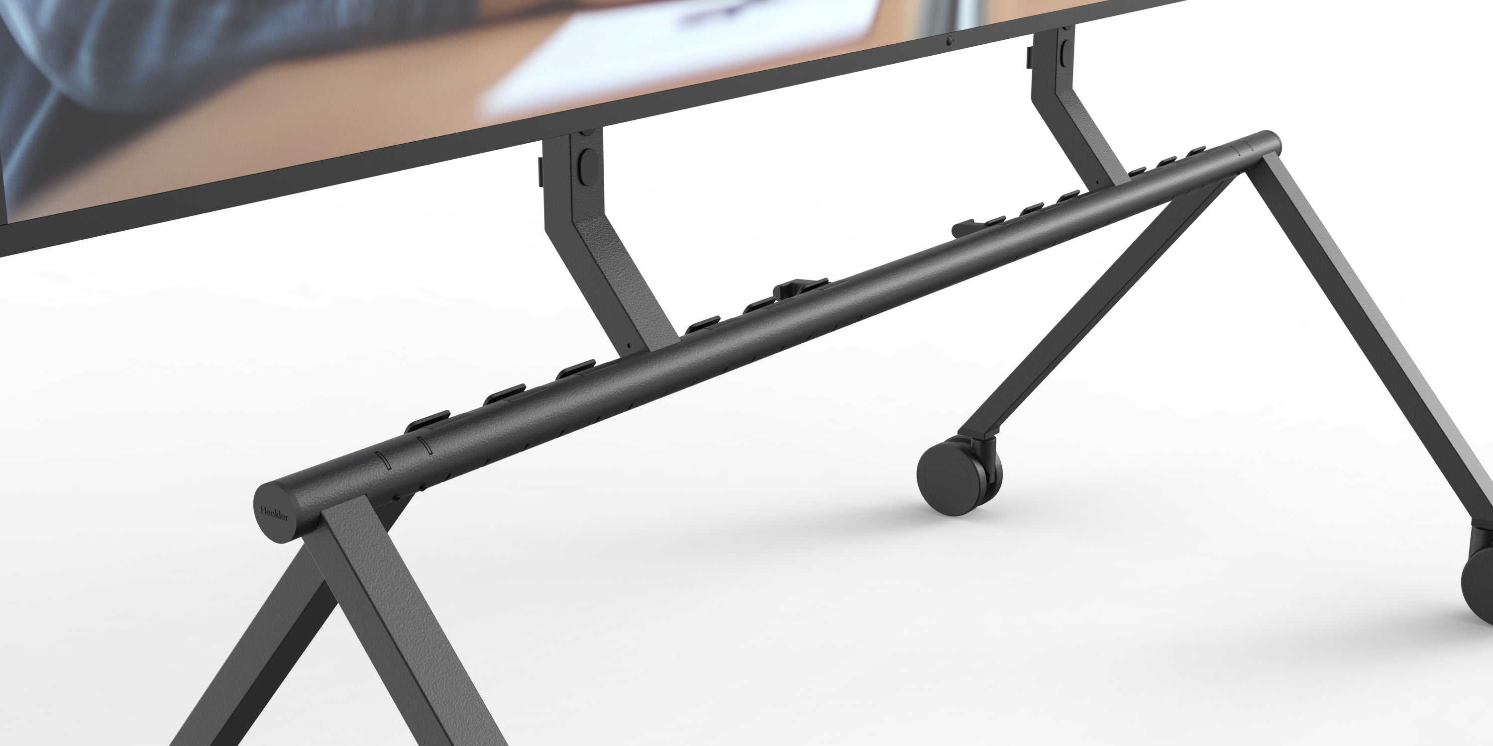 The patent-pending Heckler Connection System with set-screw locking, larger rectangular steel box-beam legs and columns, and a one-piece structural beam create a stiffer, more rigid stand than its predecessor. Oversized five-inch total-lock casters roll smoothly and lock firmly. Compact nested storage.
