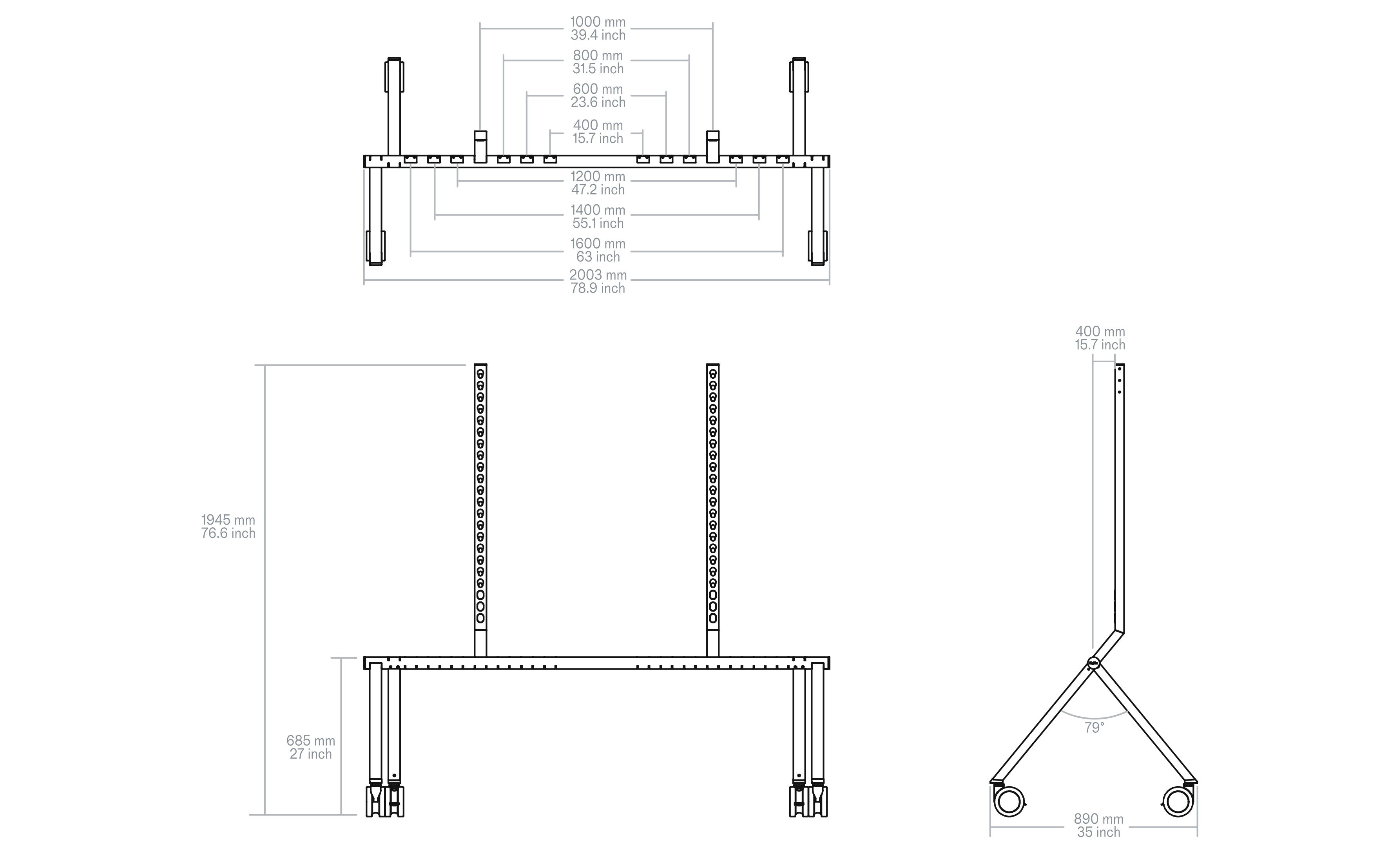 Adjustable column and beam architecture supports mounting patterns from VESA 400 to VESA 1600. Standardize on one rolling stand across display brands and models.