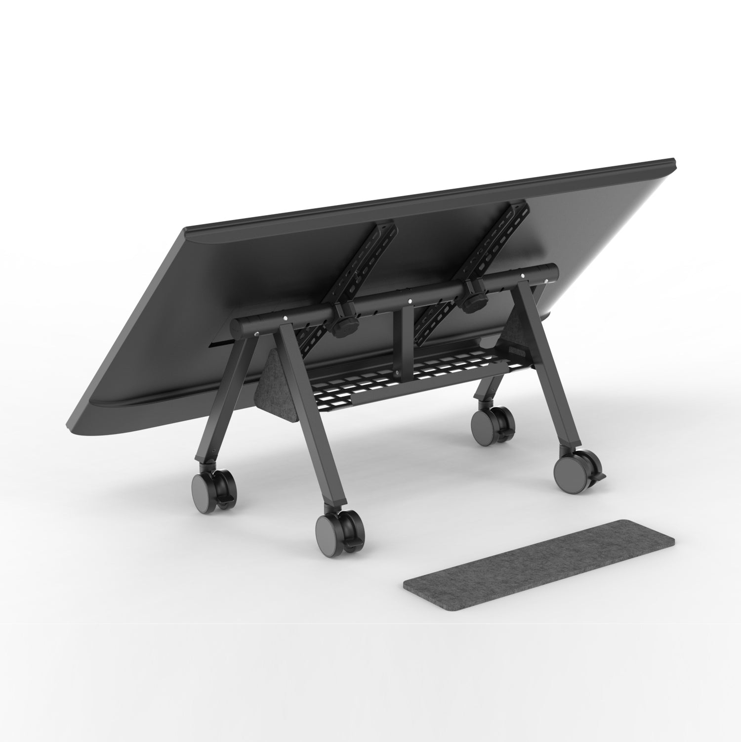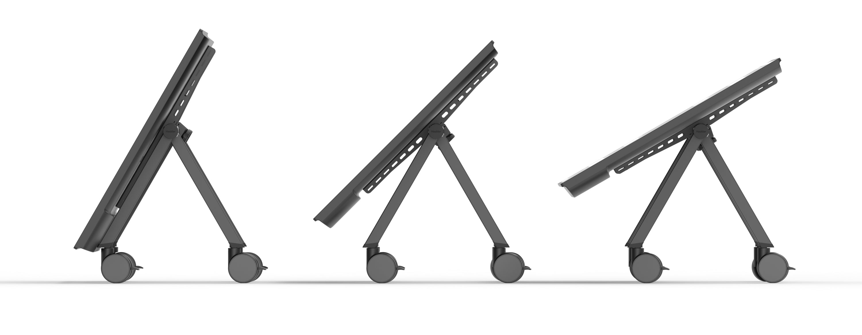 Adjustable display tilt from 30 to 60 degrees for optimal viewing in any venue. Heavy steel, commercial-grade construction supports up to 80 lb of display weight. The patent-pending Heckler Connection System assembles in two minutes without tools. Four-inch total-lock casters. Compact flat-pack disassembly for transport between events. Multiple stands nest for storage.