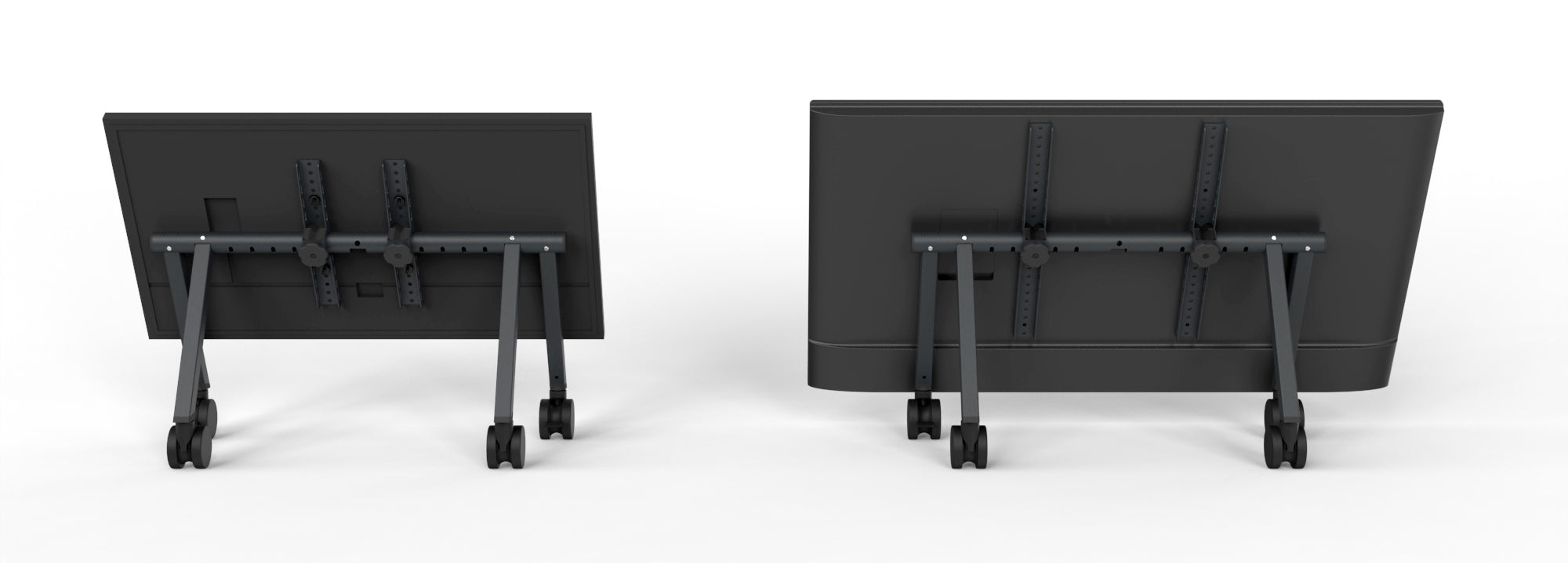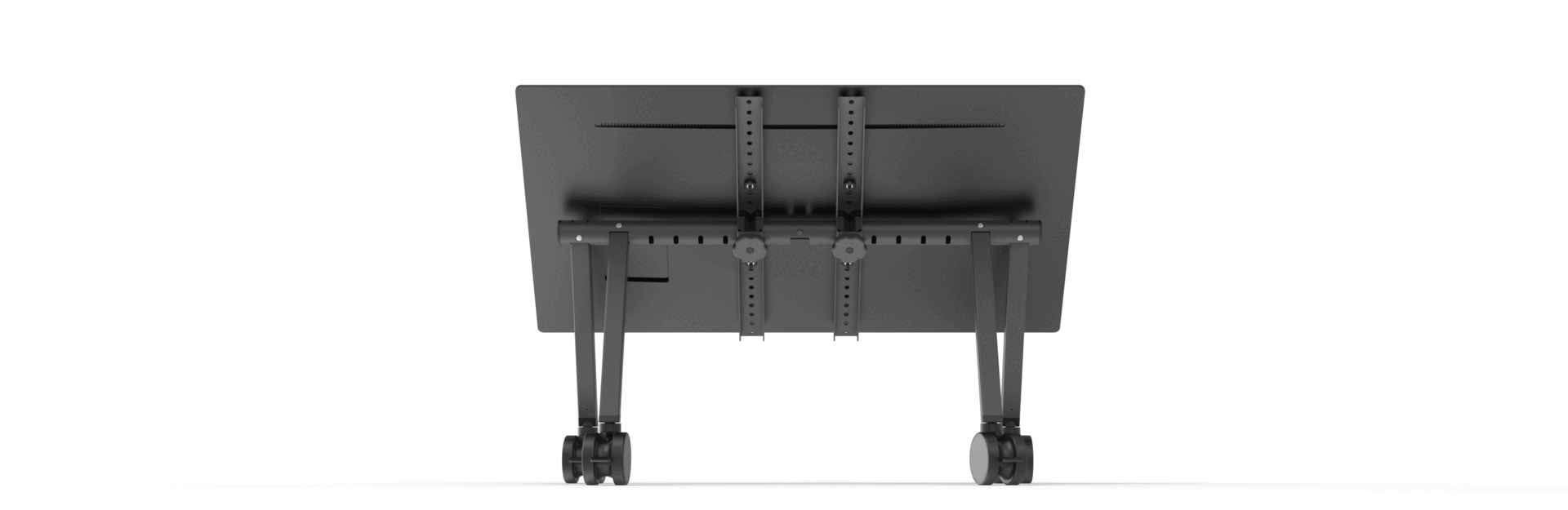 Available in two sizes. Small supports 37–55 in displays. Large supports 65–85 in displays. Arrange multiple stands in a circular array for roundtable configurations. Position content-facing displays around the room for immersive meeting and training environments.