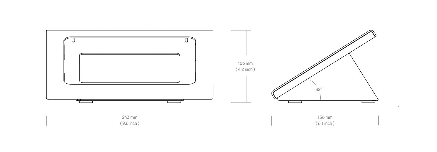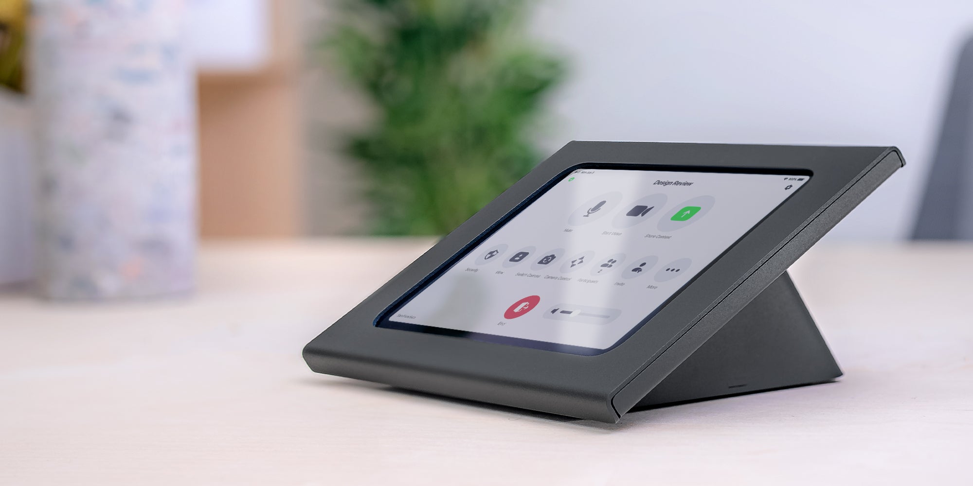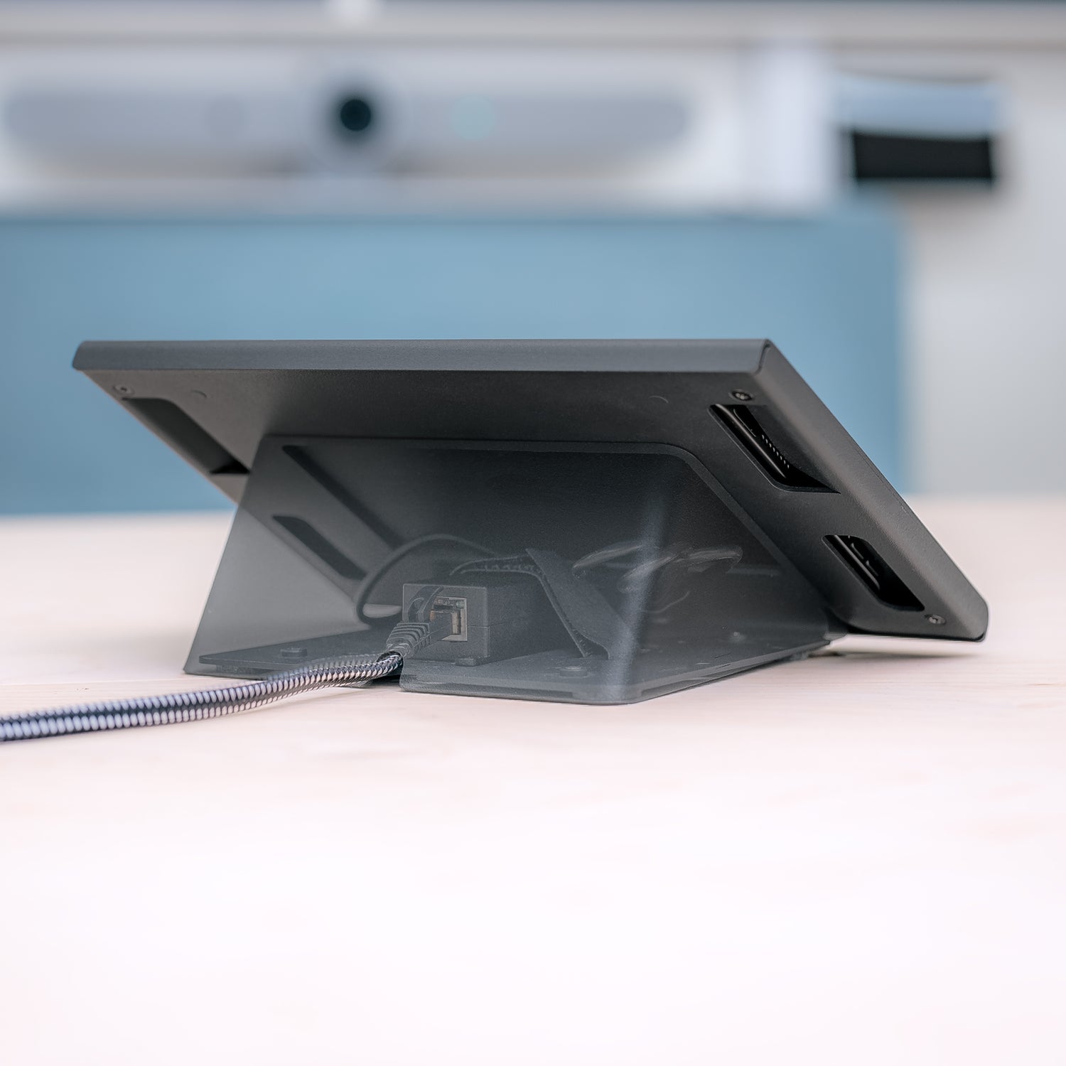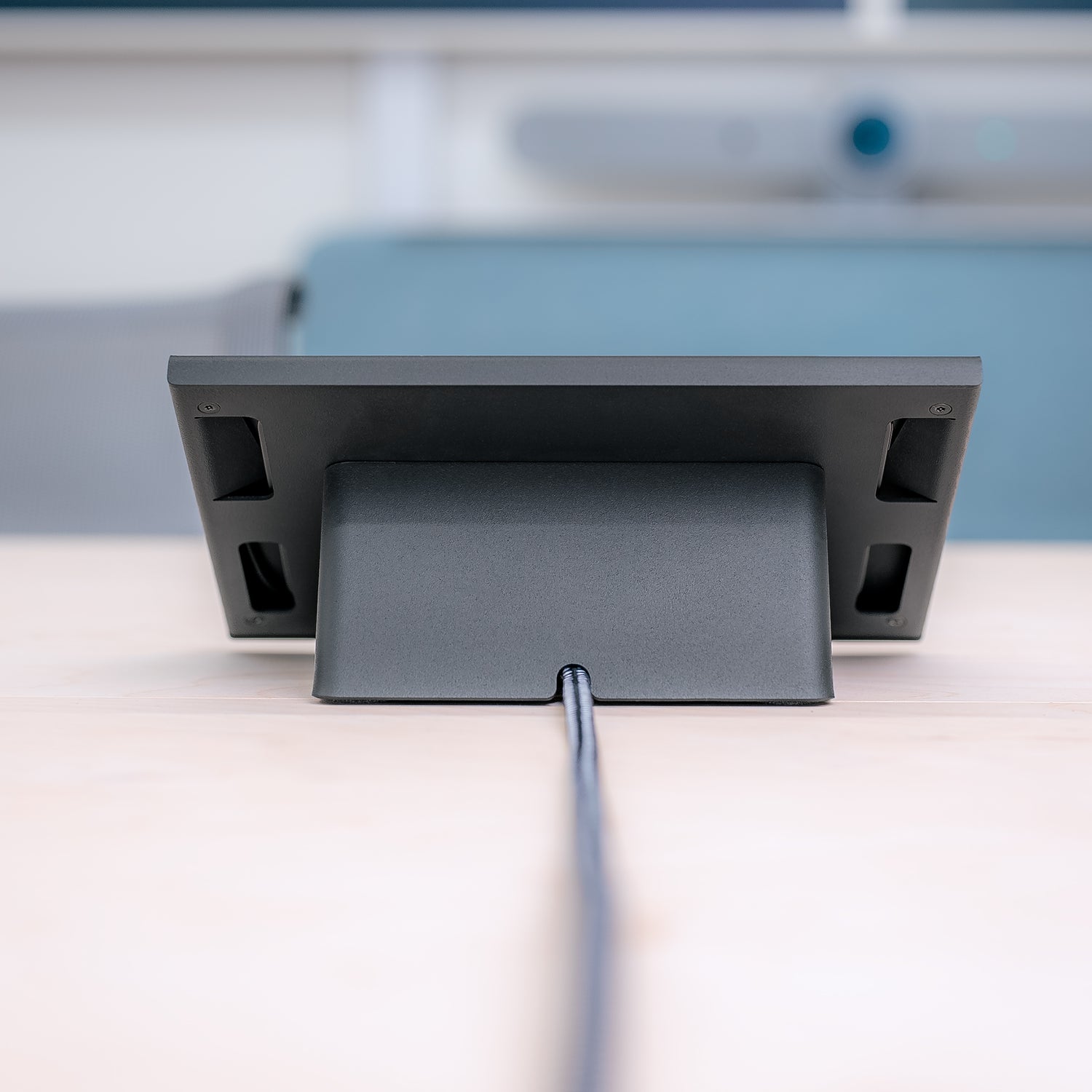 A fixed 30-degree viewing angle positions the iPad mini for comfortable meeting control without obstructing the room camera's view of participants. Felt feet on the underside allow the console to slide across conference tables for quick repositioning.